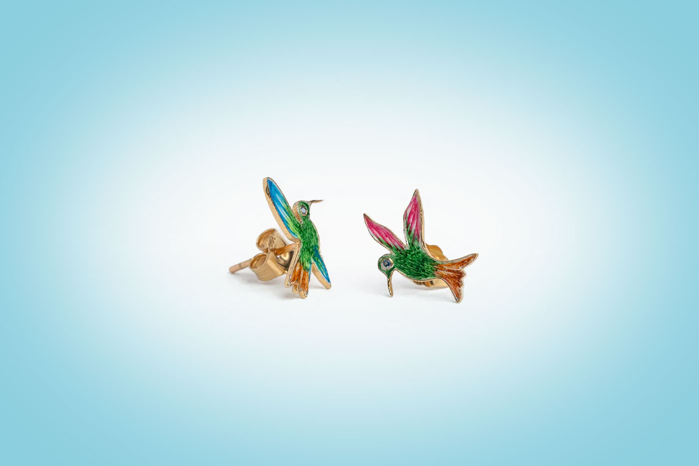 Fifty percent of proceeds benefit Daughters for Earth with this jewelry, including a single gold stud, enamel earrings with white sapphires, and a hand-painted medallion with blue sapphires, exclusively at Greenwich St. Jewelers and SuryaandtheMoonJewels.com